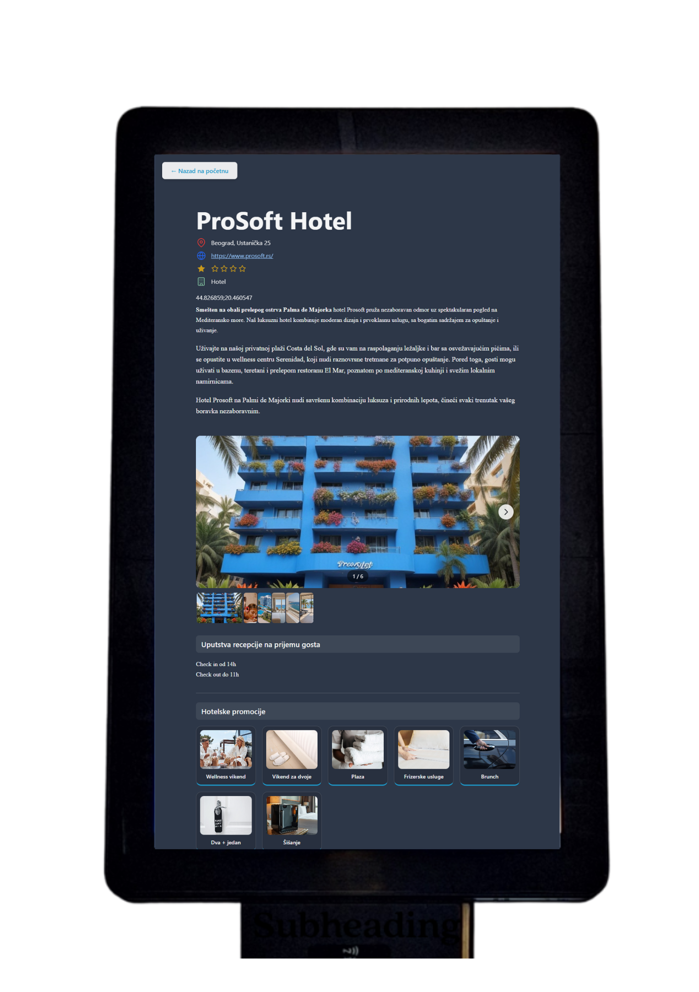 Digitalni prikaz svih hotelskih usluga, restorana ili spa centra pomaže gostima da se informišu trenutno i na klik.